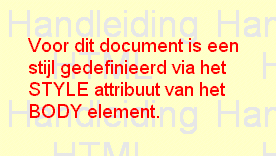 Het gebruik van stijlenMet behulp van Cascading Style Sheets kunnen voor het BODY element stijlen gedefinieerd worden. Deze stijlen kunnen een vergelijkbaar resultaat opleveren als via de attributen van het BODY element, maar daarnaast ook op andere punten de weergave van het document beïnvloeden. In het volgende voorbeeld is met het STYLE attribuut een inline stijl voor het BODY element gespecificeerd. De eigenschappen font-family en font-size zijn gebruikt om het lettertype en de lettergrootte van de tekst in het document vast te leggen. Met de eigenschappen color en background zijn de kleur van de tekst, de achtergrondkleur en de achtergrondafbeelding gedefinieerd. De padding eigenschap zorgt ervoor dat ruimte wordt vrijgehouden tussen de inhoud van het document en de rand van het venster.